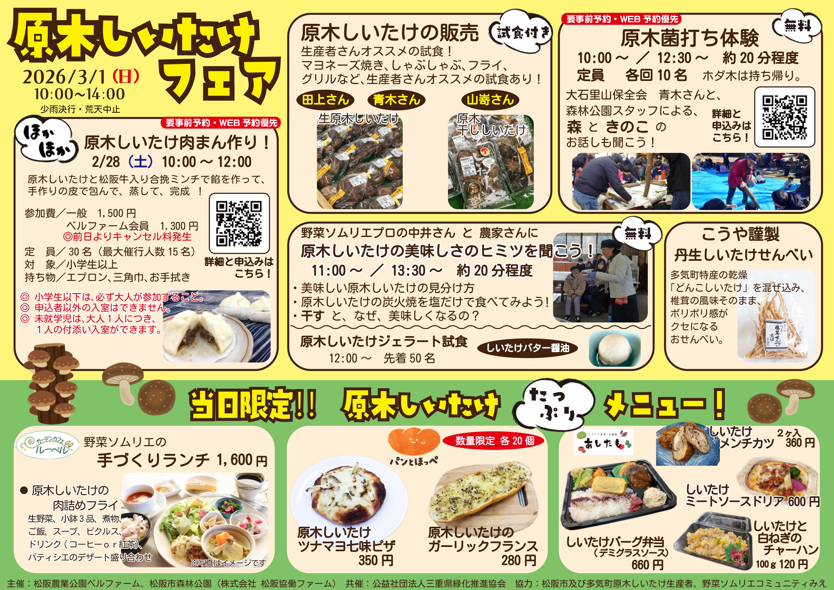 - 松阪市・多気町で活躍する3名の原木しいたけ若手生産者が松阪農業公園ベルファームに集結し、豊かな森づくりから始まる原木栽培ならではの香り高く肉厚なしいたけを丸ごと楽しめる一日です。生産者直送の鮮度抜群なしいたけの販売(試食付き)や、原木(ホダギ)に椎茸の菌を打ち込む無料の菌打ち体験(事前予約制、定員に達しています)が実施されます。野菜ソムリエプロと農家による「おいしい原木しいたけの見分け方」や「炭火焼を塩だけで食べてみよう!」、「干すとなぜ美味しくなるのか」といったトークイベントも開催されます。また、多気町特産の乾燥どんこしいたけを混ぜ込んだ「こうや謹製 丹生しいたけせんべい」の販売や、園内各ショップで原木しいたけを贅沢に使った限定メニューが登場します。さらに、原木しいたけジェラートの試食(先着50名)や、親子で楽しめる「原木しいたけ肉まん作り」特別体験(2月28日開催)も企画されています。このイベントは、春の旬を迎える肉厚で旨みたっぷりのしいたけを存分に味わえる絶好の機会です。