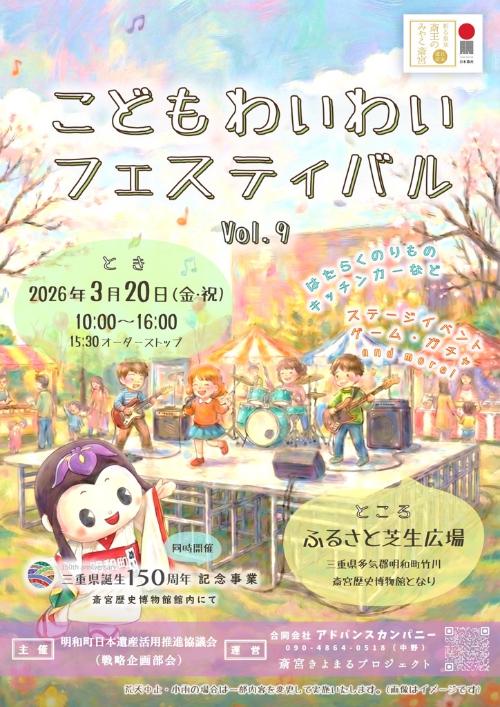 - 三重県明和町で「こどもわいわいフェスティバル開催」が開催されます。会場には消防車やクレーン車など、地域で活躍する「はたらくのりもの」が大集合し、迫力ある展示が楽しめます。お子様はもちろん、大人も楽しめる企画です。音楽ステージでは、よゐこの濱口優さんがリーダーを務めるロックバンド「THE EARLY NOODLES」をはじめ、明和太鼓保存協会やCherry BonBonなど、多彩なゲストによるライブパフォーマンスが予定されています。体験エリアでは、古代衣装の試着体験や投壺(とうこ)に挑戦できるほか、明和町のキャラクター「めい姫」が登場し、子どもたちとの紙芝居や触れ合いの時間も設けられています。さらに、ひじきうどんやポップコーン、野菜などの販売もあり、キッチンカーも出店します。会場では、イベントをより一層楽しめる会場配置図も用意されています。同時開催として、斎宮歴史博物館では三重県誕生150周年記念事業が実施され、巨大段ボール迷路や斎宮跡の発掘調査、斎王まつりに関するパネル展が開催されます。3月20日には「斎王まつり」でたどる斎宮跡の足跡も行われ、こどもわいわいフェスティバルと合わせて楽しむことができます。