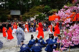 - 京の三大奇祭の一つに数えられるやすらい祭は、疫病を鎮め平安を願う春の祭礼です。平安の昔より伝えられる花鎮めの祭儀として知られ、「やすらい花」とも称されます。祭りの中心となるのは、桜や椿などで飾られた緋色のあでやかな風流傘です。この傘を中心に、赤毛・黒毛の鬼たちをはじめ約20名の行列が、お囃子に合わせて踊り歩きます。鬼たちは、飛び跳ねるように踊りながら地域を練り歩き、疫病を鎮めるかのように賑やかに進みます。風流傘の下に入ると、一年を無病息災で過ごせると伝えられており、多くの人々が健康を願って傘の下をくぐります。この祭りは、囃子や歌舞で花の精を追い立て、風流傘に宿らせて社へとおさめるという、独特の儀式によって執り行われます。