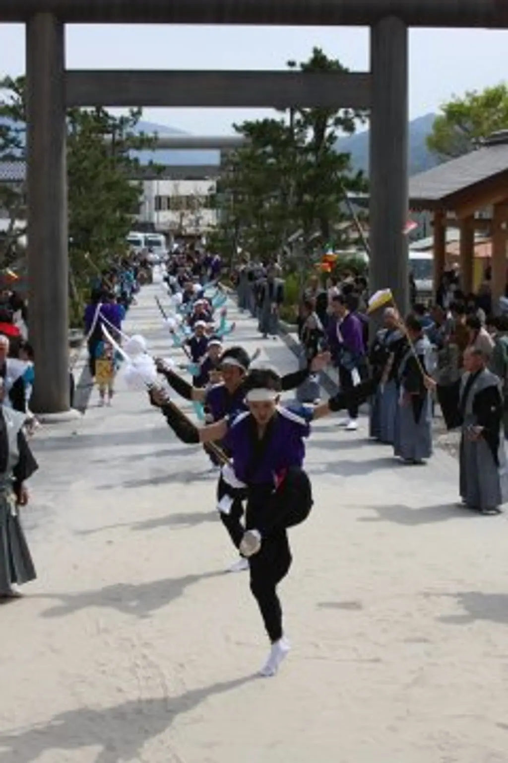 - 2500年以上の歴史を持つ丹後最古の祭礼で、神輿の行列が地域を一巡する「御神幸」が見どころです。祭礼の前後に繰り広げられる「太刀振り」や「神楽」も注目で、特に「太刀振り」は平安時代から始まったと伝わる由緒ある奉納神事で、京都府無形文化財にも指定されています。この祭りは、懿徳天皇4年(紀元前507年)に始まったと伝えられ、当初は「藤祭」と称されていました。欽明天皇の御代に賀茂祭が「葵祭」と称されるようになり、当社でも「葵祭」と呼ばれるようになったと伝えられています。当神社ともゆかりの深い京都の賀茂社の葵祭では、祭員が冠に葵の葉を付けるのに対し、豊受大神ゆかりの藤の花を挿すのが古例となっています。祭の要となるのはご祭神の神霊をお遷しした大神輿によるご神幸(お渡り)で、ご祭神の再誕(再生)を示す「御生れ神事」です。また、ご神幸の道中や祭典の前後に繰り広げられる平安時代以来の典雅勇壮な太刀振や神楽などの奉納行事が、神の御生れを祝福すると共に神賑わいを盛り上げます。