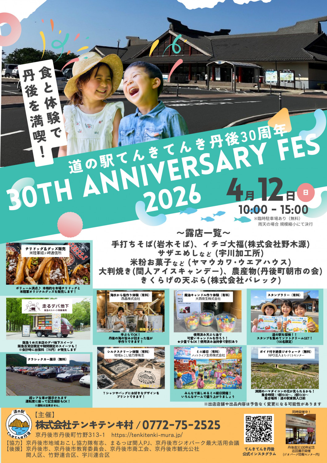 - 今年30周年を迎える道の駅てんきてんき丹後にて、食と体験で丹後を満喫できる「30TH ANNIVERSARY FES」が開催されます。当日は、手打ちそば、農産物、大判焼き、サザエめし、米粉お菓子、キクラゲ天ぷら、チリドッグ、スイーツ移動販売など、多彩な露店が出店し、丹後の味覚を堪能できます。さらに、大人も子どもも楽しめる催しが盛り沢山です。無料の体験としては、ガイド付きの絶景ジオウォーク、ミニ縁日、クラシックカー展示(運転席に座って記念撮影も可能)が楽しめます。有料の体験では、スタンプラリー、海水から塩づくり体験、廃油キャンドル作り体験、シルクスクリーン体験が用意されています。雨天の場合でも、規模を縮小して開催されます。