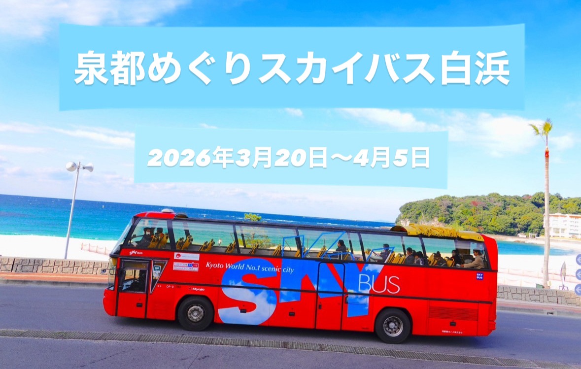- 屋根のないオープントップバスで白浜の名所を巡る「泉都めぐりスカイバス白浜」が期間限定で運行されます。昭和時代に運行されていた「泉都めぐりバス」が、オープントップバスとして復活。開放感あふれる乗り心地と、昭和の白浜観光を懐かしく感じるアクティビティです。地元ガイドによる情緒豊かな案内、和歌山県産「生みかん」の車内食べ放題、白浜随一の桜の名所「平草原公園」での桜鑑賞、日の入りに合わせたドラマチックな「サンセット」便などが楽しめます。発着拠点は「フィッシャーマンズワーフ白浜」と「JR白浜駅」です。運行期間は令和8年3月20日(金・祝)から4月5日(日)までの17日間。大人3,000円(税込)、子供1,500円(税込)で、ガイド案内と「生みかん食べ放題」が含まれます。運行ルートは、海岸線の絶景を巡る「白浜BLUE 王道絶景コースA・B」、桜鑑賞が楽しめる「春らんまん 桜パノラマコース」、夕景を巡る「ドラマチック 感動サンセットコース」などが計画されています。