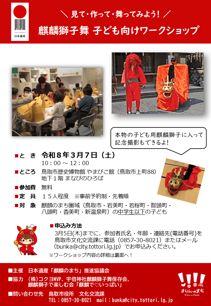 - 鳥取市歴史博物館やまびこ館で開催される、子ども向けの麒麟獅子舞ワークショップです。本物の麒麟獅子舞を見学し、オリジナルの獅子頭を作成します。さらに、実際に麒麟獅子舞を体験できる貴重な機会です。子ども用の獅子頭に入って記念撮影も可能です。このワークショップは、日本遺産「麒麟のまち」推進協議会が主催し、次代を担う子どもたちが「因幡・但馬の麒麟獅子舞」に親しみ、理解を深めることを目的としています。参加者は、麒麟のまち圏域(鳥取市、岩美町、若桜町、智頭町、八頭町、香美町、新温泉町)の中学生以下の方が対象です。本物の子ども用獅子頭も登場し、中に入って記念撮影ができるなど、子どもたちが麒麟獅子舞の世界を肌で感じられる工夫が凝らされています。事前申込制となっており、定員は15名程度です。