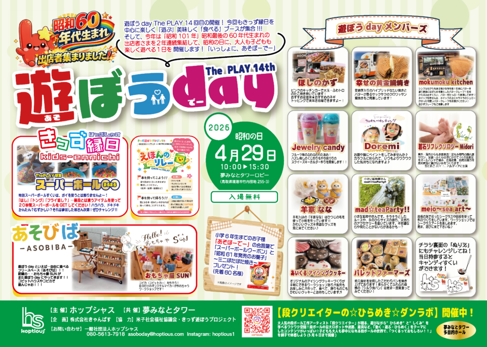 - 「遊ぼうday The PLAY 14th」は、鳥取県境港市の夢みなとタワーで開催される、子供から大人まで楽しめるイベントです。14回目の開催となる今回は、きっず縁日を中心に、美味しいものを味わえるブースも多数出店します。さらに、今年は「昭和101年」として、昭和最後の60年代生まれの出店者が2年連続で集結し、昭和の日にちなんだ企画も展開されます。大人も子供も一緒に楽しめる、遊びと食の祭典です。