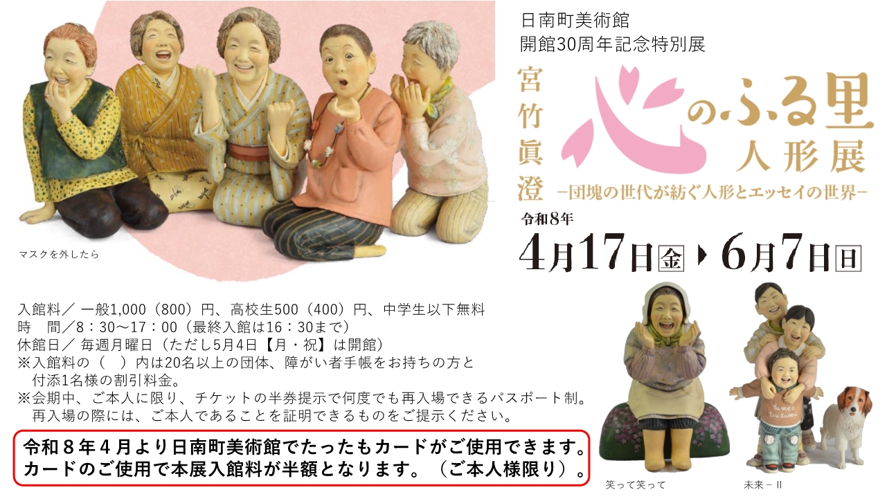 - 日南町美術館開館30周年記念特別展「宮竹眞澄 心のふる里人形展-団塊の世代が紡ぐ人形とエッセイの世界-」の一環として開催されるギャラリートークです。本展では、昭和から現代に至る人々の暮らしの情景を再現した宮竹眞澄氏の創作人形が展示されます。これらの人形は、観る者の記憶や懐かしさと重なり、家族や仲間との大切な絆を呼び起こす感動的な作品群です。ギャラリートークでは、作家自身が作品に込めた思いや制作背景について語られることが期待されます。この機会に、人形に込められた温かい物語と、作家の感性に触れてみてはいかがでしょうか。