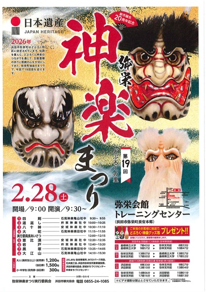 - 島根県浜田市弥栄町で開催される「第19回どぶろくの里弥栄神楽まつり」は、石見神楽の魅力を存分に堪能できるイベントです。地元の神楽団体が多数出演し、迫力ある演目を一日中楽しめます。会場では、どぶろく特区に認定されている弥栄町で作られたどぶろくや地元産野菜の販売も行われます。来場者には、抽選でどぶろくや神楽グッズがプレゼントされる特典もあります。プログラムは、「四剣」「道返し」「八十神」「大蛇」「恵比須」「岩戸」「黒塚」「大江山」など、多彩な演目が予定されており、石見神楽の奥深さを体験できます。開場は9時、開演は9時30分からで、大人(高校生以上)の前売券は1,200円、当日券は1,500円、小・中学生は300円です。