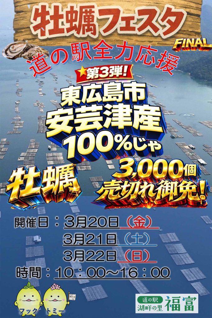 - 東広島市福富町にある道の駅湖畔の里福富で、「牡蠣フェスタ第3弾」が開催されます。このイベントでは、広島県産、特に東広島市安芸津町産の牡蠣を100%使用した、新鮮で旬な牡蠣料理を堪能できます。焼き牡蠣や牡蠣フライなど、冬の味覚を代表する海の恵みを、できたての美味しさで味わえるのが魅力です。会場では、東広島市安芸津町産の牡蠣を使った焼き牡蠣をはじめ、広島県産牡蠣を使用した焼き牡蠣や牡蠣フライなど、旬の牡蠣料理が楽しめます。地元で育まれた冬の味覚を、できたてで味わえる貴重な機会です。冬ならではの海の恵みを味わいに、ぜひ道の駅湖畔の里福富へお越しください。入場は無料です。
