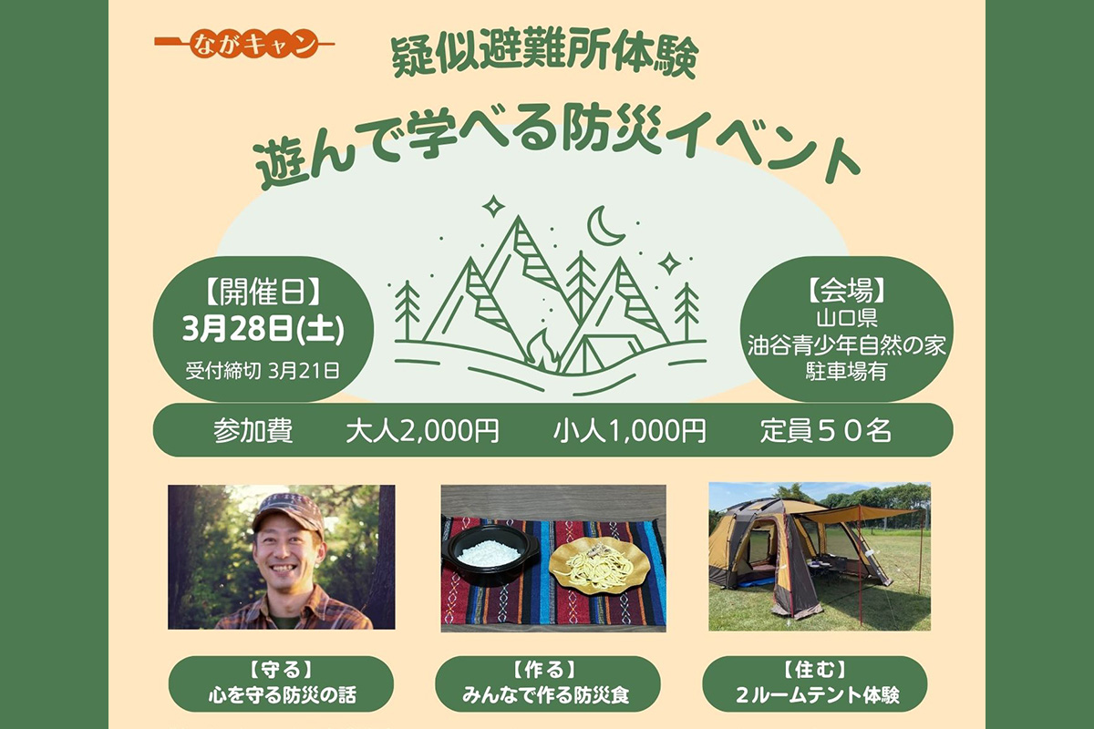- 春休み、家族で「心を守る防災」について遊びながら学べる体験型イベントが開催されます。自然体験活動指導者のJJ.OUTDOOR「じんさん」を講師に迎え、「アイラップでつくる防災ごはん体験」や「2ルームテント設営体験」などのワークショップを通じて、もしもの時に役立つ防災の知恵を楽しく習得できます。子どもから大人まで、発見や「やってみたい!」がいっぱいのイベントです。