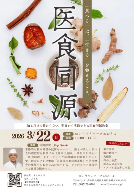 - 「食べる」は「生きる」を整えること。知るだけで終わらない、明日から実践できる医食同源の料理教室が開催されます。本格的な技術をベースに、誰もが楽しく学べる料理教室を展開する「食の伝道師」こと吉岡淳次さんを講師に招き、「大豊町」ならではの食材を使った料理教室が開催されます。参加者には、なんと「レシピ」もプレゼント!見て、食べて、覚えて、作って、翌日から健康になれる内容となっています。