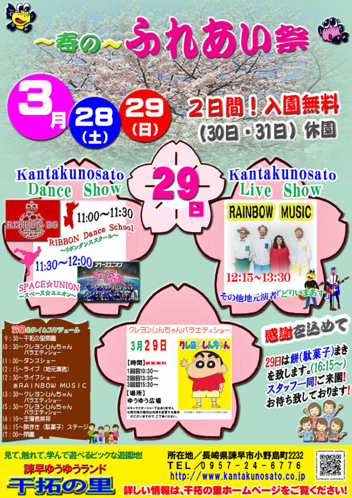 - 諫早ゆうゆうランド干拓の里にて、株式会社県央企画最後の主催イベントとして「~春の~ふれあい祭」が開催されます。開園から31年5ヶ月にわたり干拓の里を管理運営してきた県央企画が、感謝の気持ちを込めて贈るイベントです。当日は入園無料となり、様々な催し物が予定されています。メインイベントとして「クレヨンしんちゃん バラエティショー」が複数回上演されるほか、ダンスショーや地元演者によるライブパフォーマンスも楽しめます。フィナーレには、干拓の里指定管理会社である県央企画の代表取締役からの挨拶と、社員一同による紅白餅&駄菓子まきが行われます。この祭りは、県央企画が主催する最後のイベントであり、干拓の里の歴史に幕を閉じる前の特別な機会となります。ご家族やご友人と一緒に、感謝の気持ちを分かち合いながら楽しむことができます。