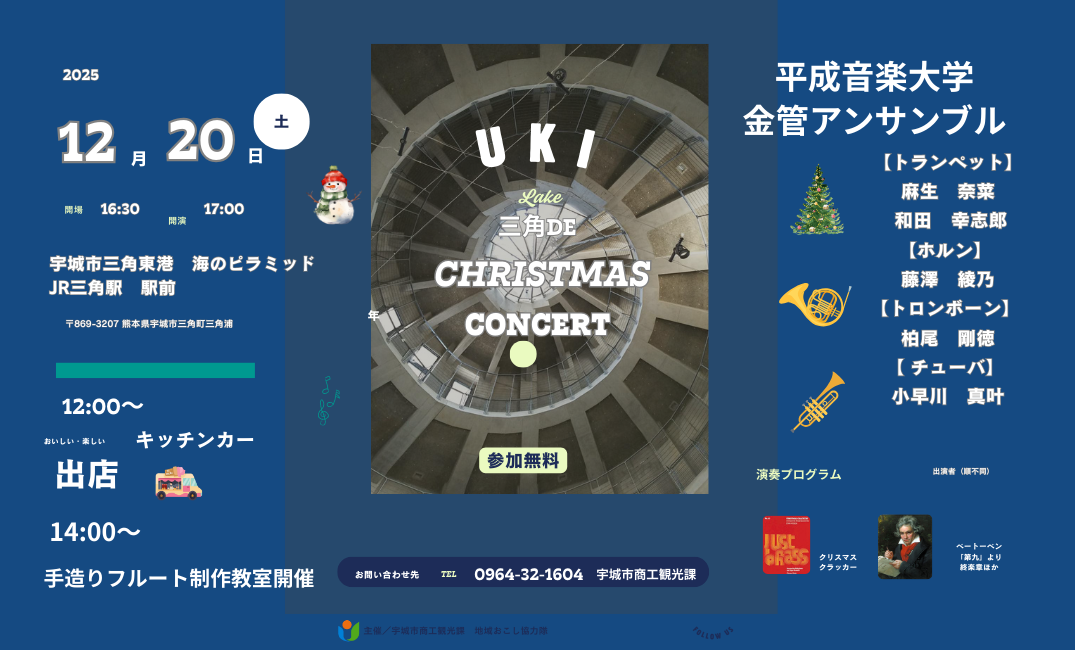 - 三角東港のドーム状施設「海のピラミッド」を舞台に開催されるクリスマスコンサートで、今回は**金管アンサンブル**による演奏が予定されています。音響に優れたドーム内で、トランペットやホルンなど金管楽器特有の華やかで澄んだハーモニーが響き渡る演奏は、冬の冷えた心と体を温めるクリスマスシーズンらしい特別な音楽体験を提供します。当日は夕方の演奏に加え、昼からキッチンカーや屋台、販売ブースが並ぶマルシェが開かれ、地元の食や買い物も楽しめます。また楽器好き向けに数量限定の「手造りフルート製作教室(無料・約50本)」が実施され、参加者は自作のフルートを持ち帰ることができます(制作は数量限定で演奏会開場の30分前に終了との記載あり)。アクセスはJR三角駅から徒歩1分と便利で、入場無料の地域イベントとして家族連れや音楽愛好者に親しまれる催しです。