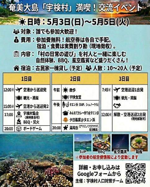 - 奄美大島の宇検村を訪れ、村民と共に島の魅力を満喫する交流イベントです。ルーツがある方もない方も大歓迎で、古民家を貸し切り、雑魚寝形式での宿泊を通じて濃密な交流が生まれることが期待されます。イベントでは、宇検村の自然や文化に触れ、地域住民との温かい交流を体験できます。島での生活や文化を肌で感じ、忘れられない思い出を作る絶好の機会となるでしょう。