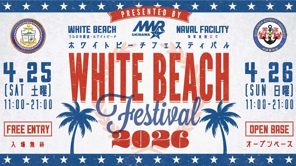 - 2026年4月25日(土)・26日(日)の2日間、沖縄県うるま市勝連にある米海軍施設ホワイトビーチにて「ホワイトビーチフェスティバル 2026」が開催されます。このイベントは、米海軍基地ならではの魅力を体験できるオープンベース・フェスティバルです。主な見どころとして、アメリカ海軍の軍艦や海上自衛隊の護衛艦に乗船見学できる「戦艦ツアー」や、オスプレイ、ヘリコプターなどの軍用機展示、迫力ある車両展示が例年行われています。メインステージでは、有名アーティストによる音楽ライブや、日米の文化が融合するパフォーマンスが披露されます。フードコーナーでは、本場アメリカンフードをはじめ、ギリシャ料理、インド料理、日本の屋台など世界各国の味が楽しめ、特にアメリカンピザやステーキケバブは人気です。基地内のコンビニではアメリカ製のお菓子や飲み物の購入も可能です。また、大型トランポリンや滑り台などのキッズ向け遊戯施設も充実しており、ファミリーで一日中楽しめる内容となっています。入場には有効な身分証(パスポート、マイナンバーカード、または運転免許証と住民票原本のセットなど)が必要です。詳細は公式発表後に再確認が必要です。
