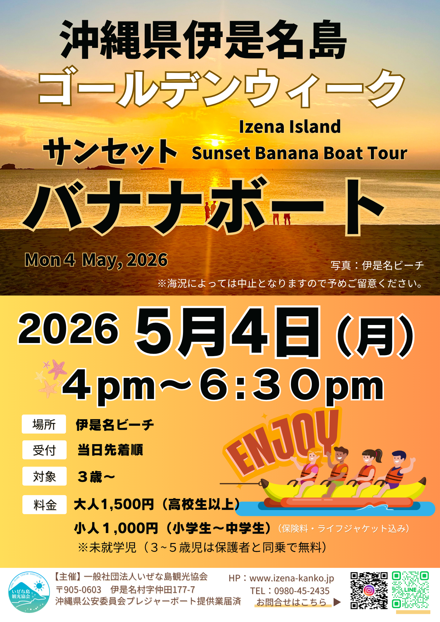 - ゴールデンウィークの特別企画として、伊是名島の美しい海で最高の夕日を楽しみながらバナナボートツアーが開催されます。3歳以上の方が参加可能で、体験料金は大人1,500円(高校生以上)、小人1,000円(小・中学生)です。未就学児(3〜5歳)は無料ですが、保護者の同乗が必須となります。料金には保険料とライフジャケットレンタルが含まれており、所要時間は10分程度です。海況や天候によっては中止となる場合があるため、予めご了承ください。また、天候によりサンセットが見れない可能性もありますのでご留意ください。営業時間は目安であり、当日の潮位(満潮)から日没に合わせて開催されます。