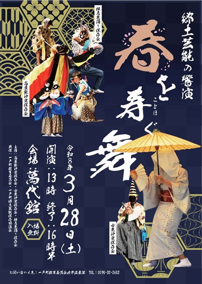 - 岩手県一戸町で「郷土芸能の響演~春を寿ぐ舞~」が開催されます。このイベントでは、高屋敷神楽保存会、女鹿神楽保存会、根反鹿踊り保存会の3団体が、国登録有形文化財である映画館「萬代舘」に集結し、春の訪れを祝う舞を披露します。入場は無料です。春の息吹を感じながら、地域の伝統芸能に触れることができる貴重な機会となるでしょう。