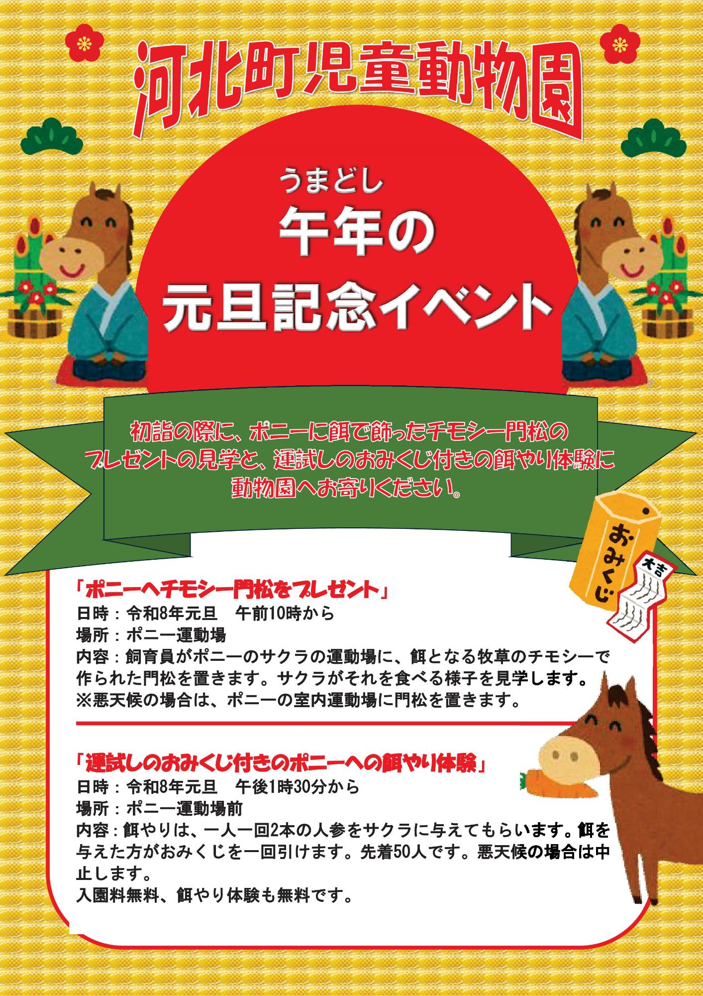 - 山形県河北町にある児童動物園で、午年の元旦を記念した特別なイベントが開催されます。飼育員がポニーのために、牧草で手作りした門松をプレゼントします。ポニーが正月限定のチモシー門松を食べる可愛らしい姿を観察できるほか、運試しおみくじ付きのポニーへの餌やり体験も実施されます。餌やり体験は1人1回2本の人参で行われ、体験した方には今年限定の動物園午年おみくじを引くことができます。餌やり体験は先着50名限定で、無くなり次第終了となります。このイベントは、ポニーとの触れ合いを通じて、来園者に楽しい新年の思い出を提供することを目的としています。
