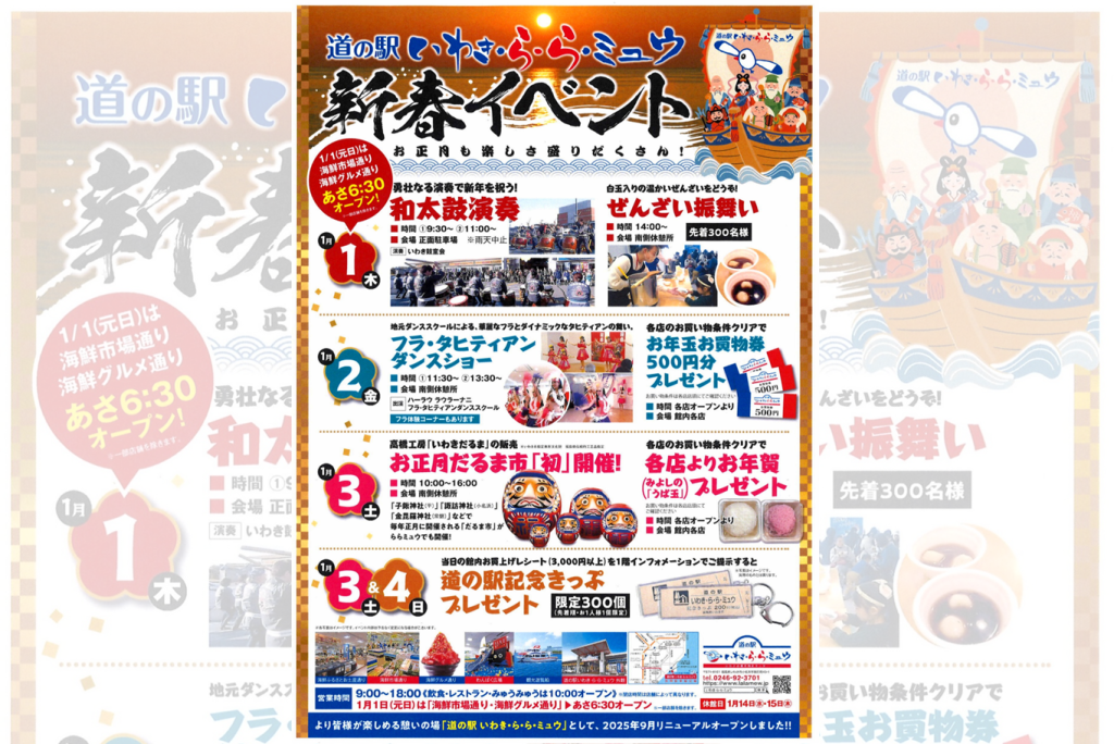 - 道の駅いわき・ら・ら・ミュウでは、2026年1月1日(木・祝)から1月4日(日)まで「新春イベント」が開催されます。元旦は海鮮市場通り・海鮮グルメ通りの一部店舗が朝6時30分にオープンし、いわき鼓童会による勇壮な和太鼓演奏で新年を祝います。また、先着300名様には白玉入りのぜんざいが無料で振る舞われます。1月2日(金)には、地元ダンススクールによる華やかなフラ・タヒティアンダンスショーが披露され、フラ体験コーナーも設けられます。さらに、各店で条件をクリアすると、館内で使用できる500円分のお買物・お食事券がプレゼントされます。1月3日(土)には、高橋工房の「いわきだるま」が並ぶお正月だるま市が初開催されます。同日と翌1月4日(日)には、当日の3,000円以上のレシート提示で、先着300名様に道の駅記念きっぷがプレゼントされる企画も実施されます。年の初めの楽しいひとときを、ご家族やご友人と過ごせるイベントが盛りだくさんです。