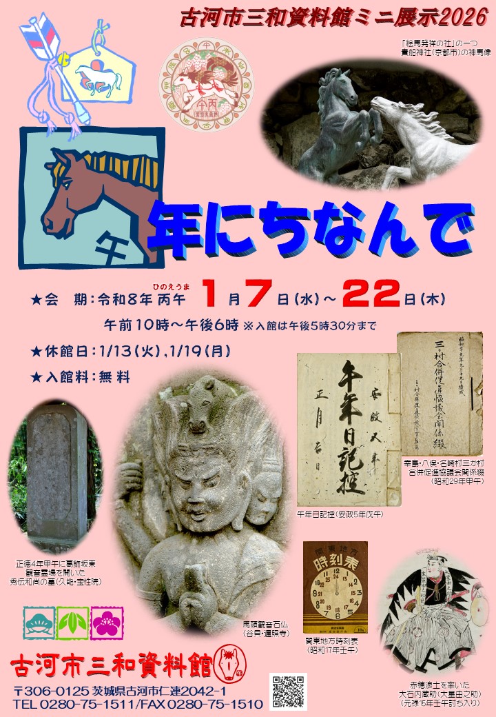 - 新年を迎え、令和8年(2026年)の干支である丙午(ひのえうま)にちなみ、午(馬)および午年に関連した資料を展示するミニ展示です。三和資料館では、2012年以来、その年の干支にちなんだミニ展示を開催しており、今回は午年にちなんだ展示を行います。午は十二支の7番目で、動物としては馬が当てられます。馬は古くから日本で軍事用、移動用、荷物運搬用として重要視されてきました。展示では、午=馬にちなんだ資料をはじめ、これまで同様、午年に起きたさまざまな出来事や、それに関連する資料・写真類を、江戸時代初期から平成期まで幅広く扱います。この展示を通して、これまで午年にどのようなことが起こったのか、どんなものが世に出されたのかを振り返ることができます。