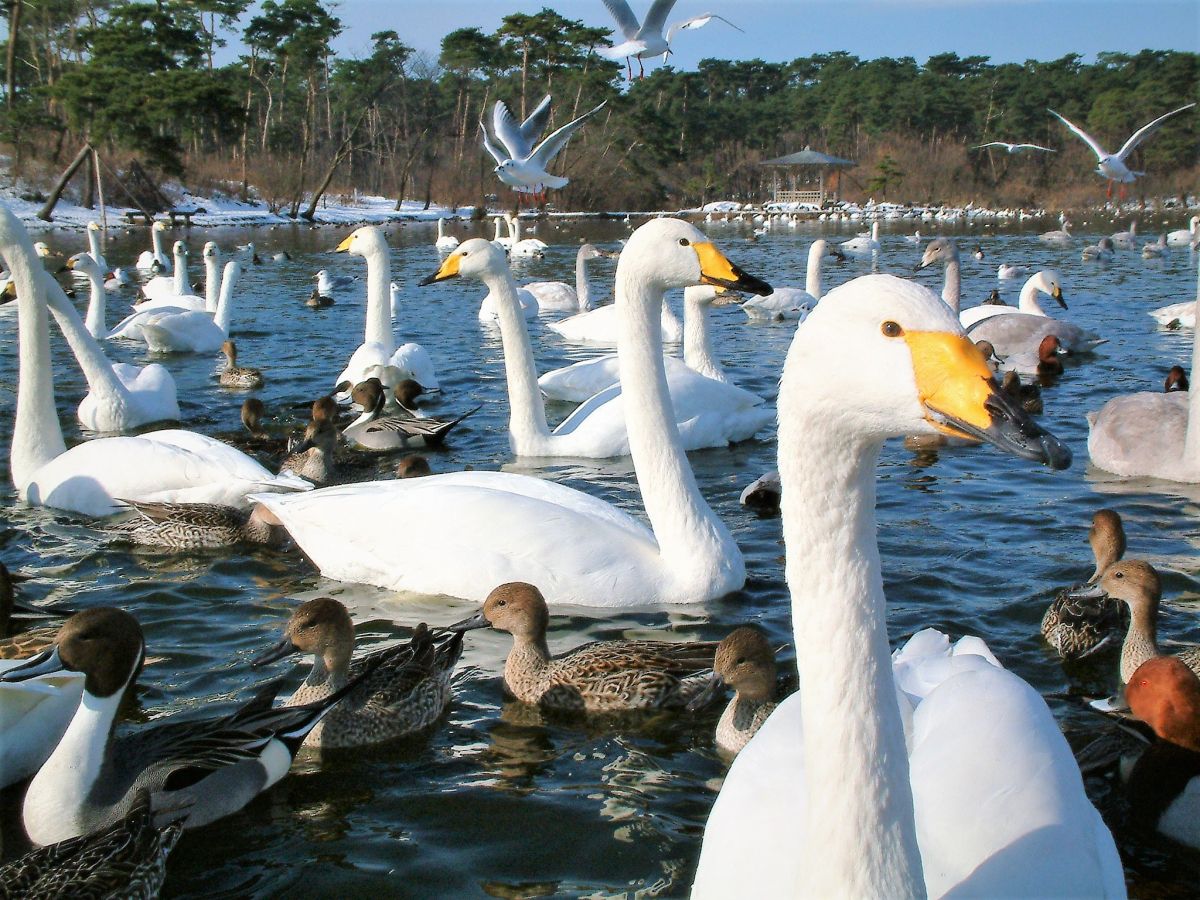 - 新潟県村上市にあるお幕場・大池公園は、毎年10月中旬から4月中旬にかけて白鳥が飛来することで知られています。この時期には、シベリアから渡ってきた約1000羽のコハクチョウが美しい赤松林に囲まれた大池に集まり、早朝や夕方には湖面に翼を休ませる姿を観察することができます。訪れる際は、白鳥が安心して過ごせるよう、ペットを連れての観察やフラッシュ撮影を控えるなどの配慮が求められています。