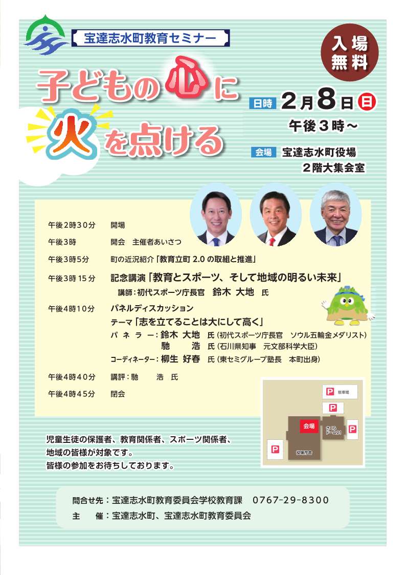 - 初代スポーツ庁長官でありソウル五輪金メダリストの鈴木大地氏を招き、「宝達志水町教育セミナー」が開催されます。記念講演では、鈴木大地氏が「子どもの心に火を点ける」をテーマに、これからの教育やスポーツについて語ります。講演後には、馳浩県知事、東セミグループ塾長の柳生好春氏、そして鈴木大地氏がパネラーとして参加し、宝達志水町の教育政策も交えたパネルディスカッションが行われます。多くの来場が期待されるイベントです。