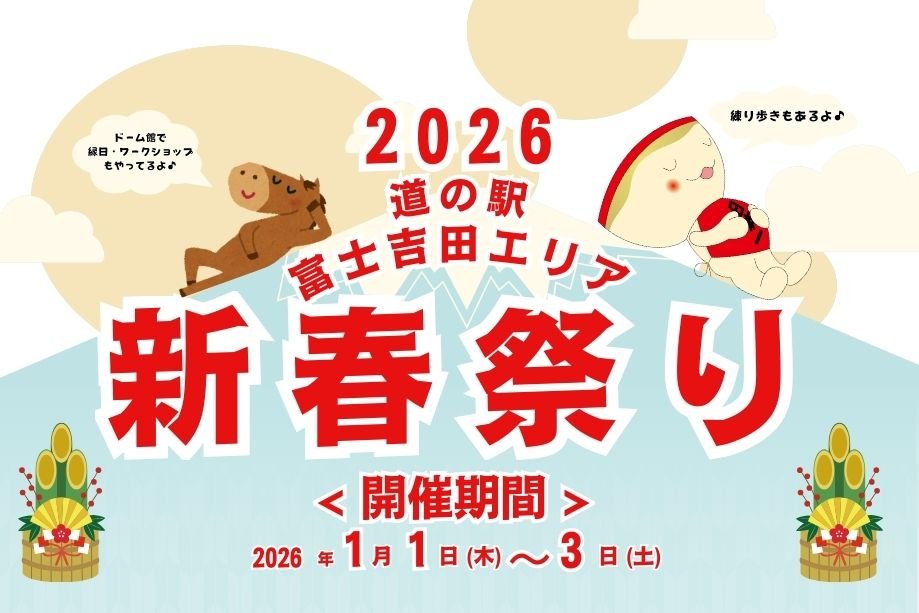 - 富士吉田市で開催される「新春祭り2026」は、毎年1月1日から3日にかけて、道の駅富士吉田を中心としたエリアで開催される新年の幕開けを祝うイベントです。ゆるキャラの吉田のうどんぶりちゃんも登場し、多くのお客さんで賑わいます。お得な福袋の販売や、新春限定の和菓子、お子様お楽しみ袋などが用意されています。また、新春特別うどん「年明けうどん」も提供され、今年の干支「午」をイメージした特別な一杯を味わえます。イベントデッキ広場では、大道芸人「たらんかん」によるジャグリングパフォーマンスや、新町獅子舞保存会による子供獅子舞公演が行われます。キッチンカーの販売や甘酒の配布もあり、新年のお祝いムードを盛り上げます。富士山レーダードーム芝生広場では、うどんぶりちゃんとのPK対決や、焼きマシュマロ無料体験(小学生以下限定)が楽しめます。富士山レーダードーム館ロビーでは、射的、お菓子すくい、千本釣りといった縁日が開催され、ゆるキャン△福袋や富士山福袋、ガラポン抽選会も実施されます。さらに、オリジナルグッズが作れるワークショップも開催され、新年の思い出作りにぴったりです。期間中、対象施設を2施設ご利用されたレシートを提示すると、新春祭り限定ステッカーがプレゼントされるキャンペーンも実施されます。縁起の良い富士山の麓で、楽しい一年の初まりをスタートしませんか。