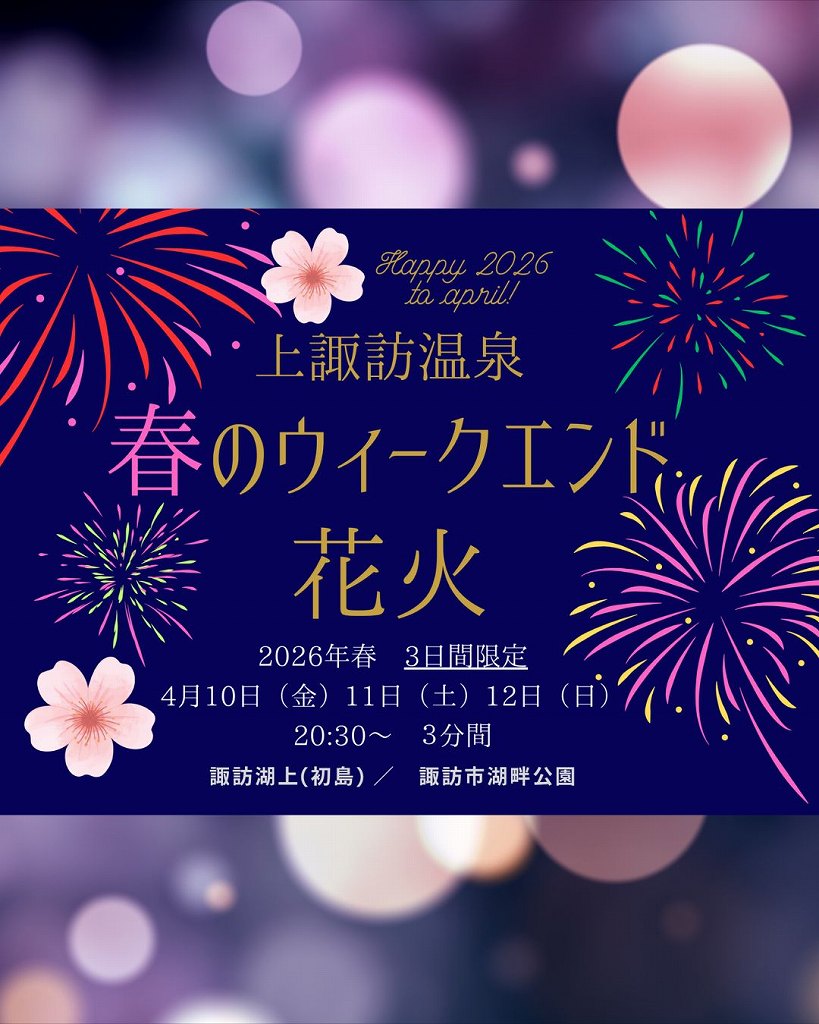 - 桜の花咲く4月、上諏訪温泉では春の信州旅行に合わせて3日間限定の花火が開催されます。春らしい色の花火、特にピンク色の花火を中心に約3分間の打ち上げが行われ、夕食時に旅館やホテルの目の前の諏訪湖上から楽しむことができます。サクラ色の花火が見られるかもしれません。宿泊者特典も多数用意されており、高島城や片倉館、アクティビティベースコグーなどの優待利用も可能です。諏訪湖スマートICの開通により、諏訪へのアクセスもさらに便利になりました。花火は諏訪湖上初島より、4号・5号・7号玉の単発打ち上げで、スターマインはありません。